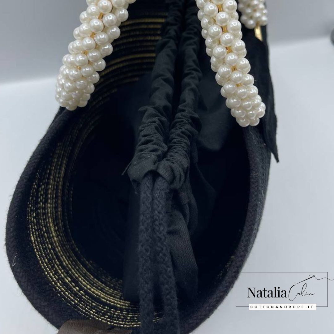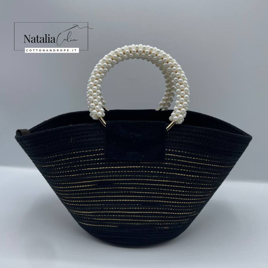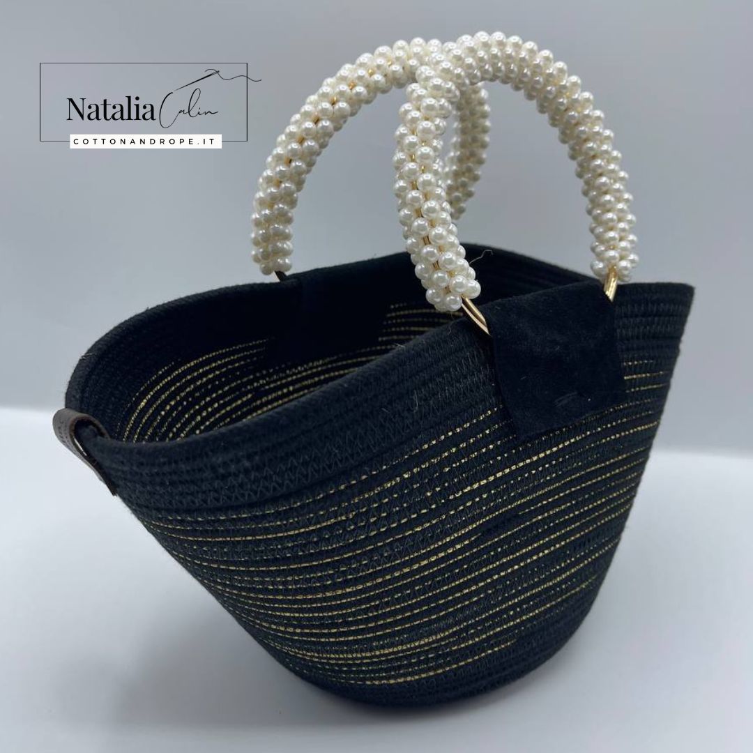 Borsa piccola con Manici Perle, in corda di cotone con anima interna rinforzata (doppia resistenza) realizzata a mano, con aggiunta di manici in metallo color oro decorati con perle di bigiotteria. Dotata di sacco di cotone di colore nero (fornito separatamente).