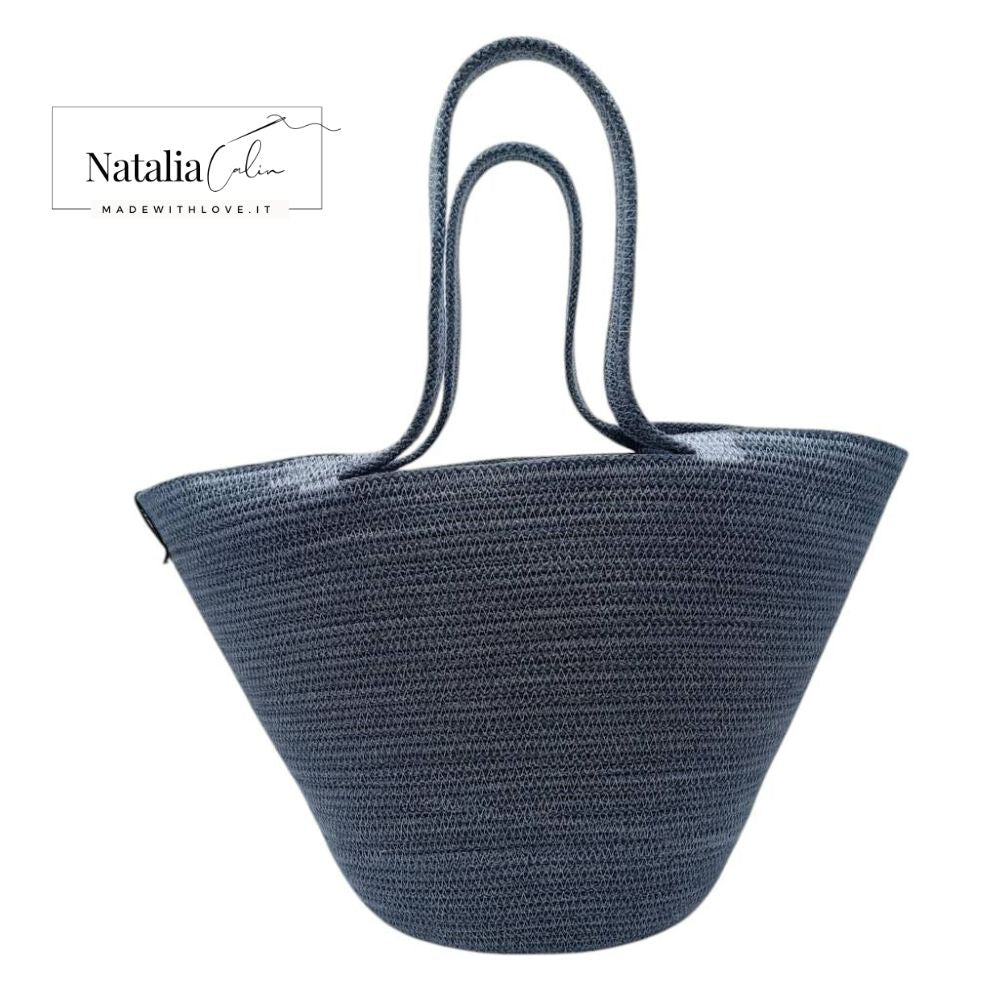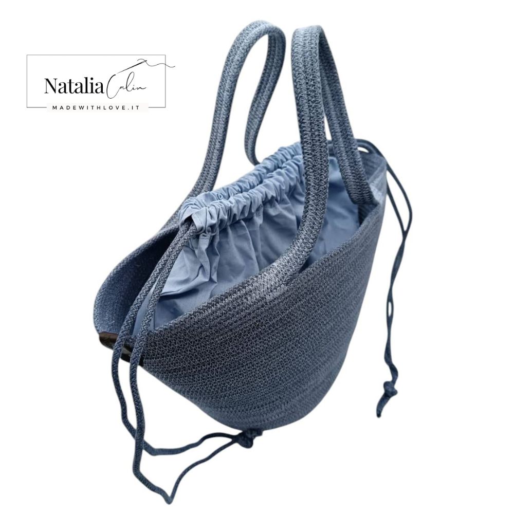 Borsa Primavera Celeste, realizzata in corda di cotone con anima interna rinforzata a doppia resistenza, la borsa è cucita a mano ed è dotata di sacco interno di cotone  (separato dalla borsa)