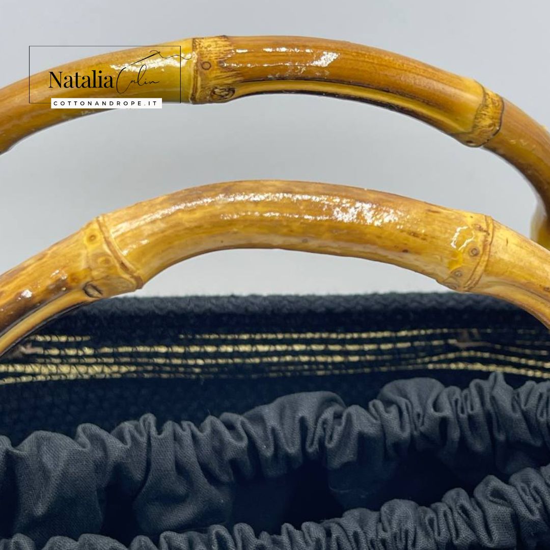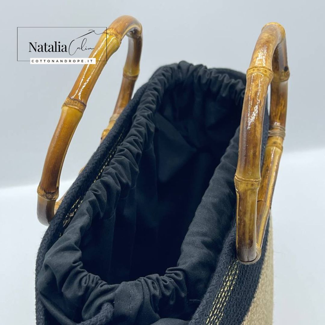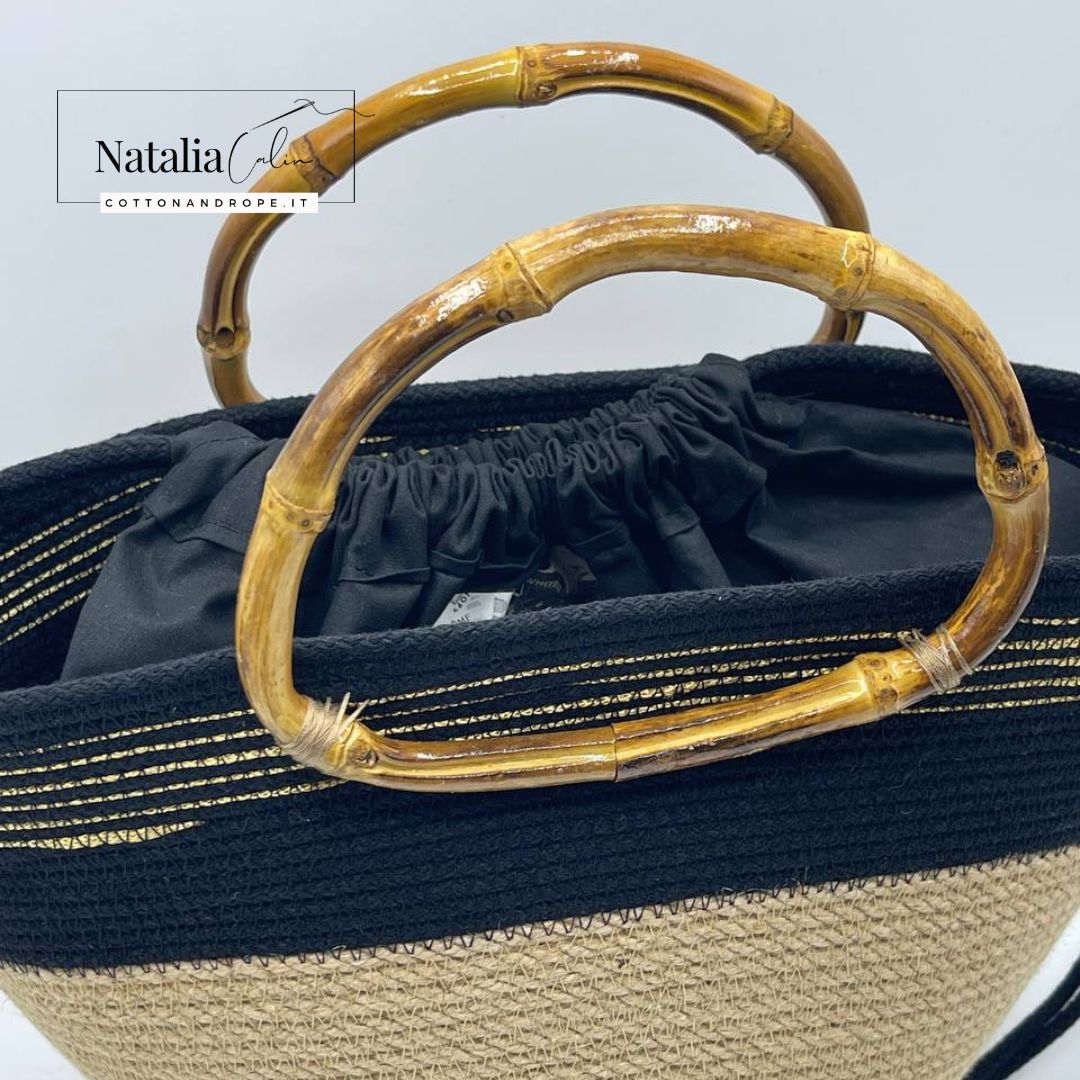 Questa borsa è dotata di un manico in bamboo e di un sacco in cotone di colore nero (sacco separato, utilizzabile secondo necessità)