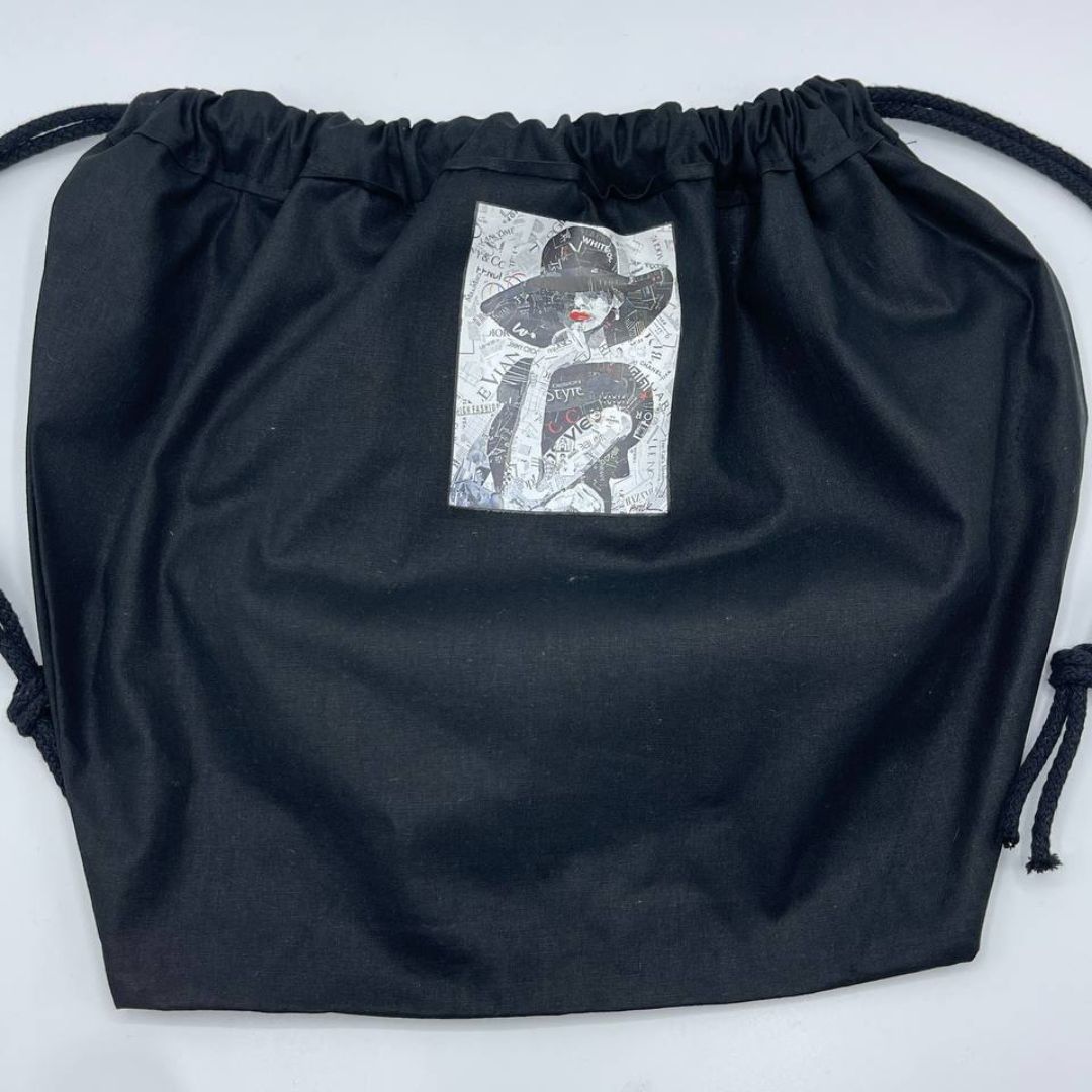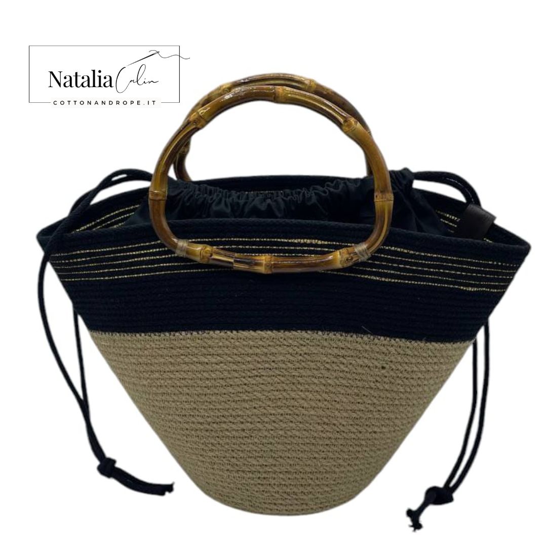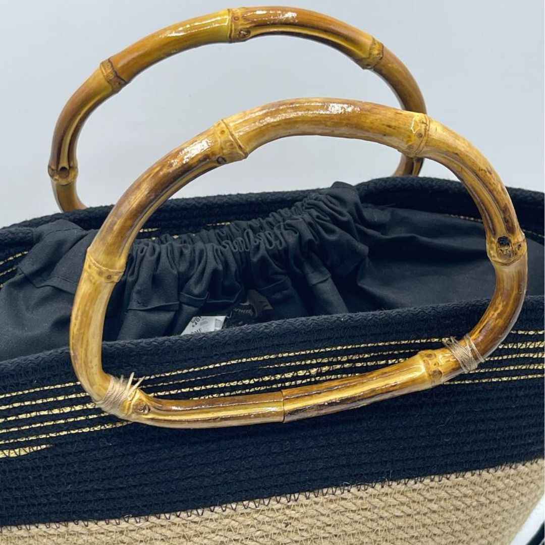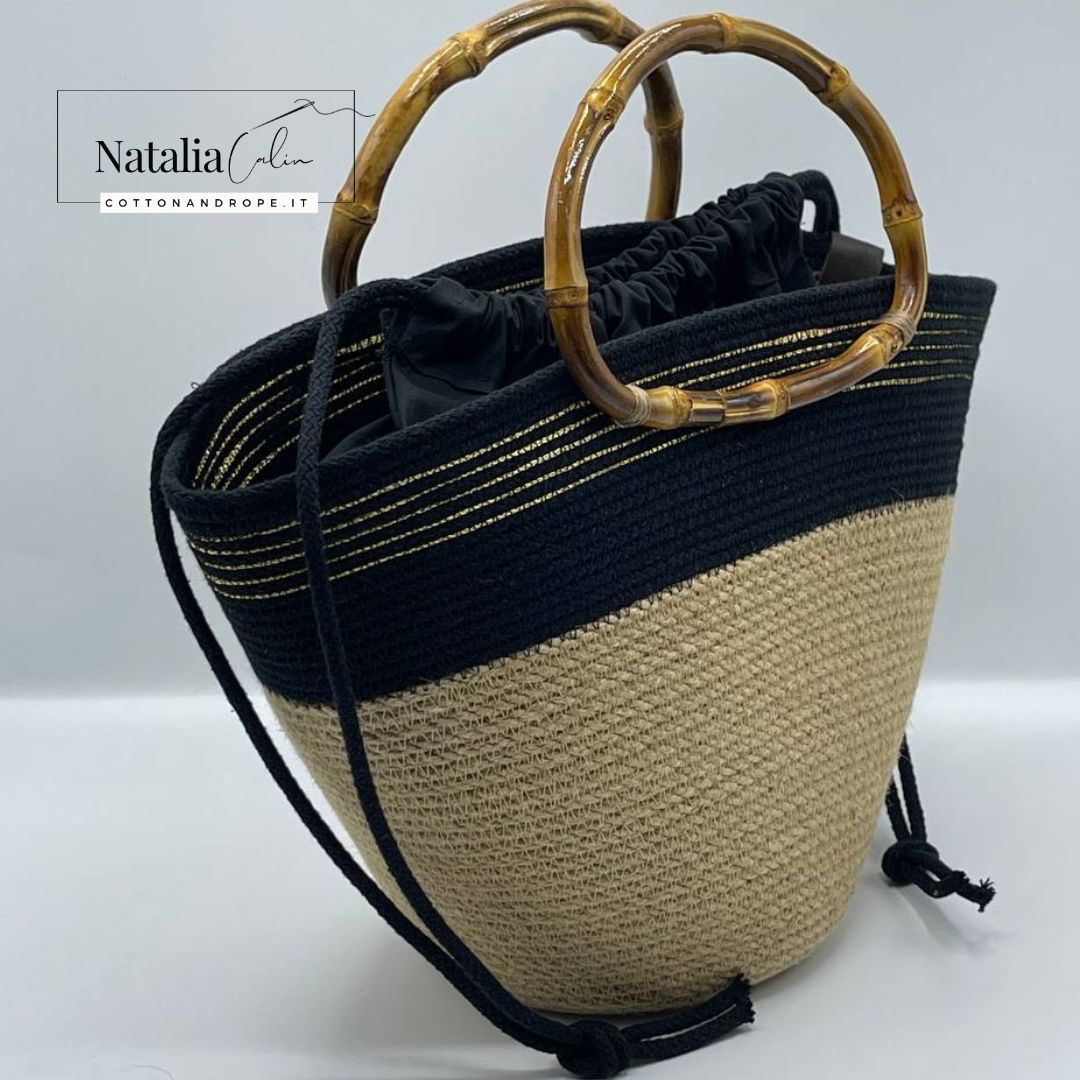 Questa borsa è dotata di un manico in bamboo e di un sacco in cotone di colore nero (sacco separato, utilizzabile secondo necessità)