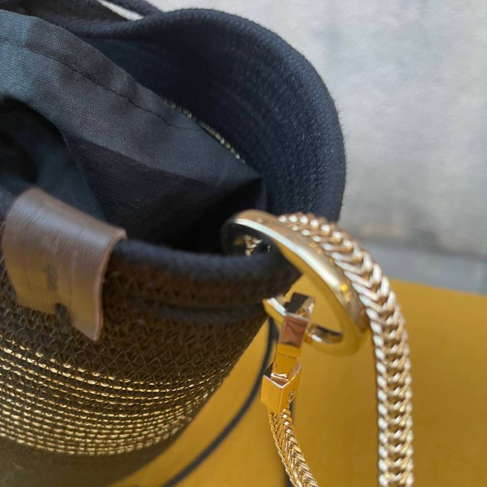 Borsa Marilyn in corda di cotone con anima interna rinforzata (doppia resistenza) realizzata a mano, con aggiunta di tracolla a catena in metallo color oro, munita di sacca interna in cotone (non cucita e quindi utilizzabile in base alle necessità)