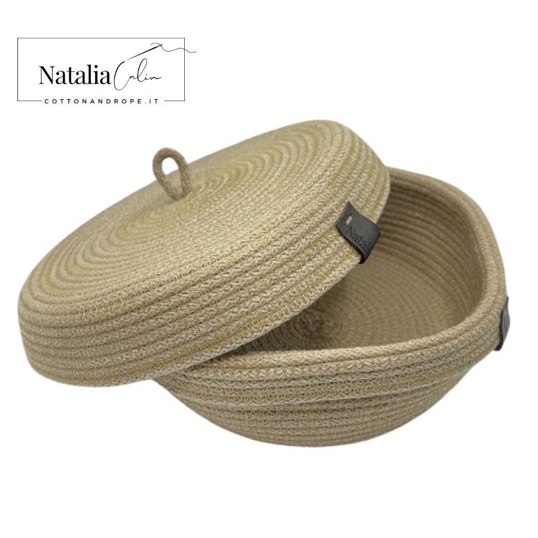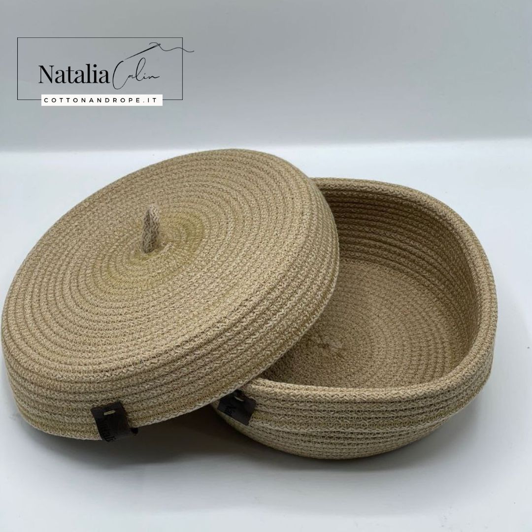 Cestino / contenitore con doppio bordo e coperchio, realizzato in corda di canapa, 21 cm x 7 cm